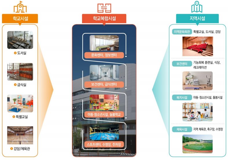 학교복합시설은 학교와 지역의 필요를 고려해 교육, 돌봄, 문화, 체육시설 등을 운영하는 시설입니다.