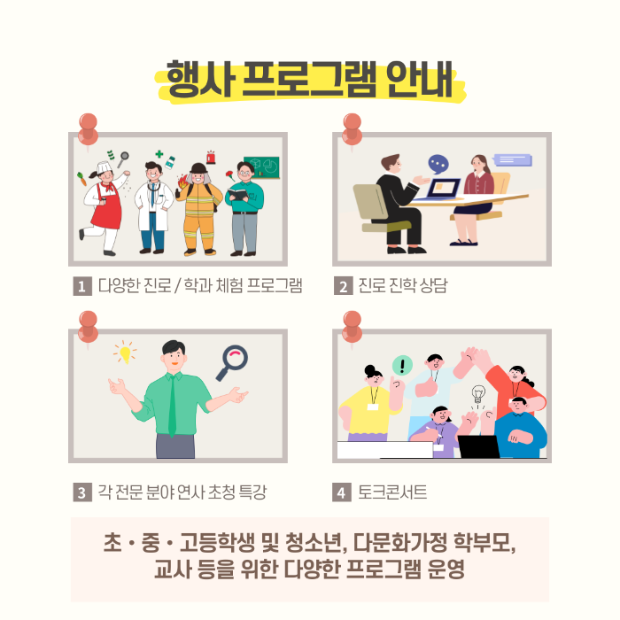 다양한 진로 / 학과 체험 프로그램, 진로 진학 상담, 각 전문 분야 연사 초청 특강, 토크콘서트 등
