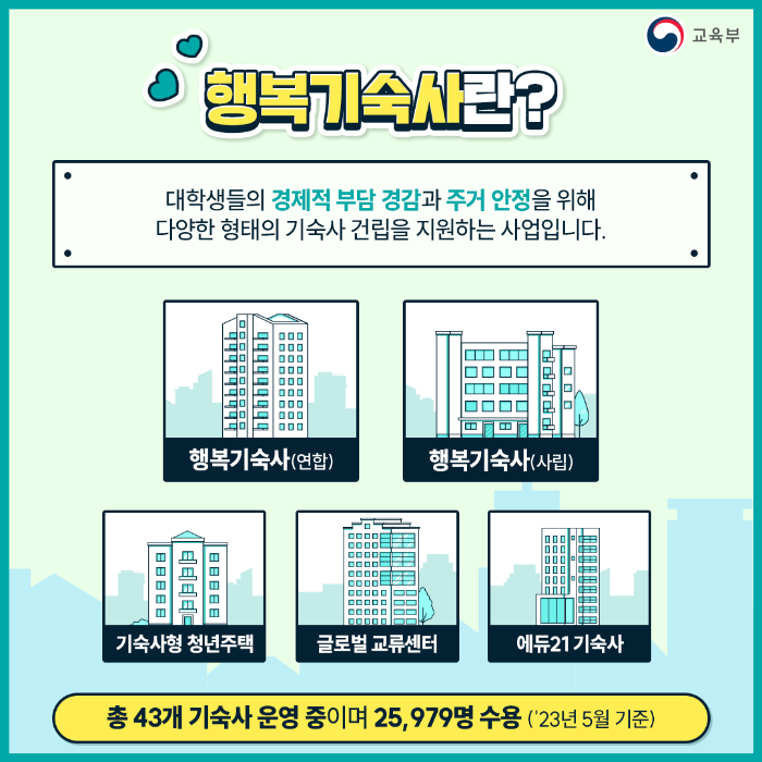 - 행복기숙사(연합), 행복기숙사(사립), 기숙사형 청년주택, 글로벌 교류센터, 에듀21기숙사 총 5가지 형태가 있습니다.