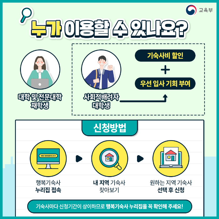 *기숙사마다 신청기간이 상이하므로 행복기숙사 누리집을 꼭 확인해 주세요!