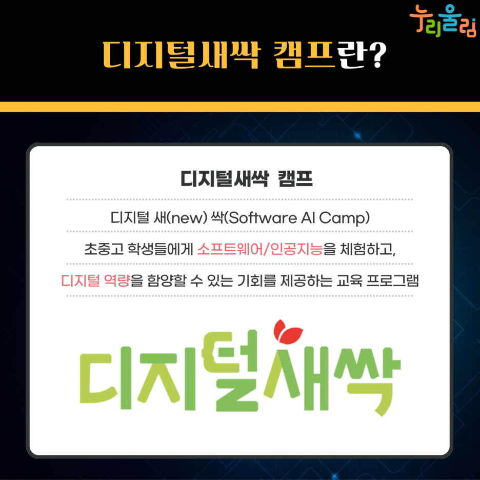 디지털새싹 캠프에 대한 구체적인 정보는 디지털새싹 누리집에서 확인 가능하니, 많은 관심 부탁드립니다.