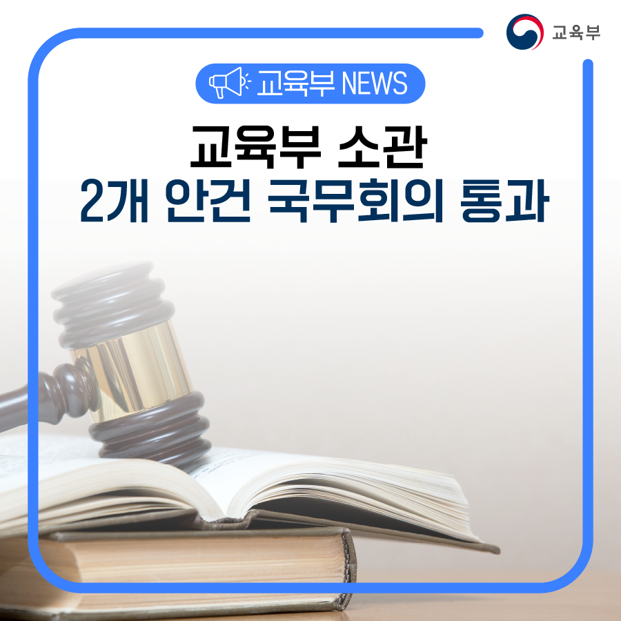 교육부(부총리 겸 교육부장관 이주호)는 6월 5일(월) 국무회의에서 「교육공무원 승진규정」, 「사립학교법 시행령」 일부개정령안이 심의·의결되었다고 밝혔다.