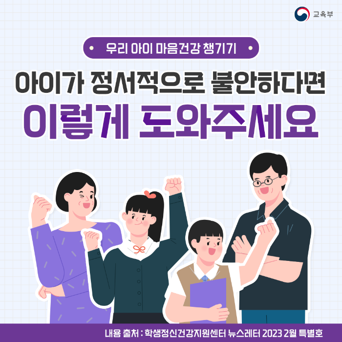 | 아이가 정서적으로 불안하다면 이렇게 도와주세요 *내용 출처 : 학생정신건강지원센터 뉴스레터 |