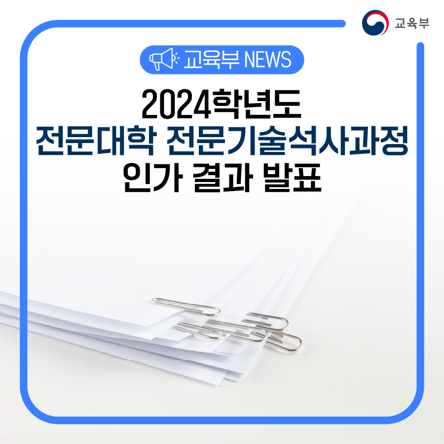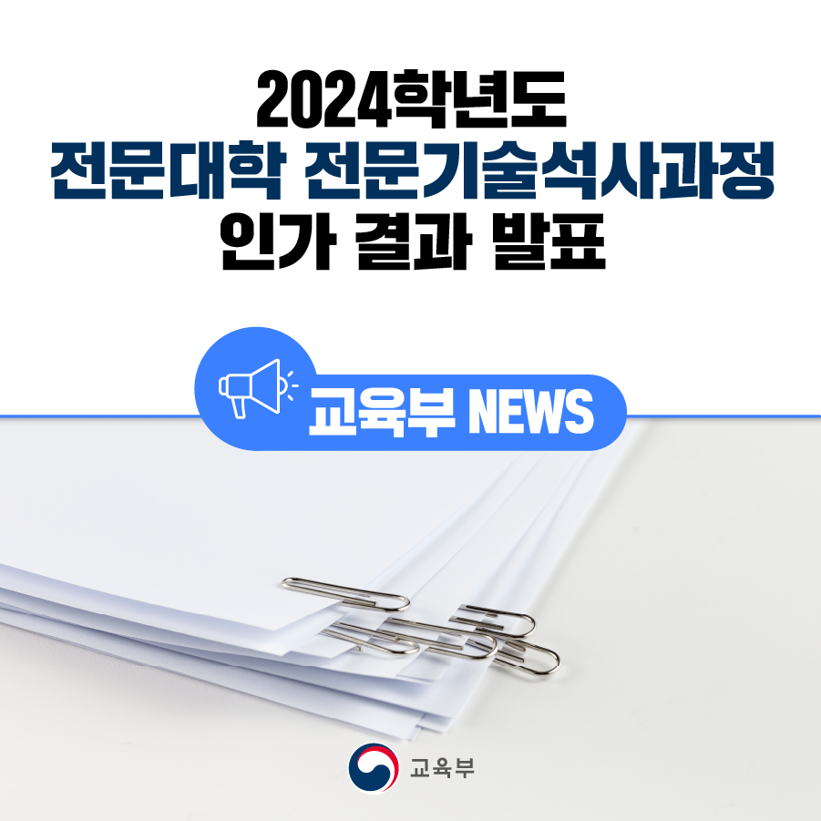 교육부(부총리 겸 교육부장관 이주호)는 6월 14일(수), 2024학년도 전문대학 전문기술석사과정(7개교 7개 교육과정, 정원 103명 규모) 인가 결과를 발표한다.