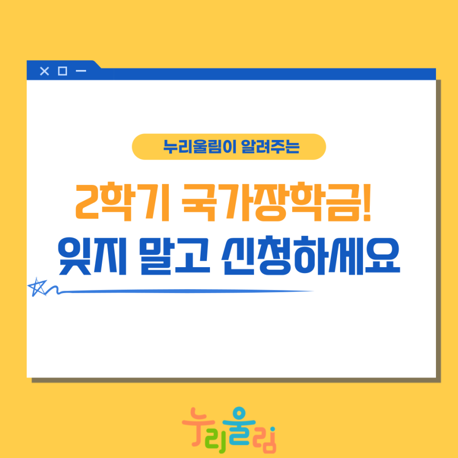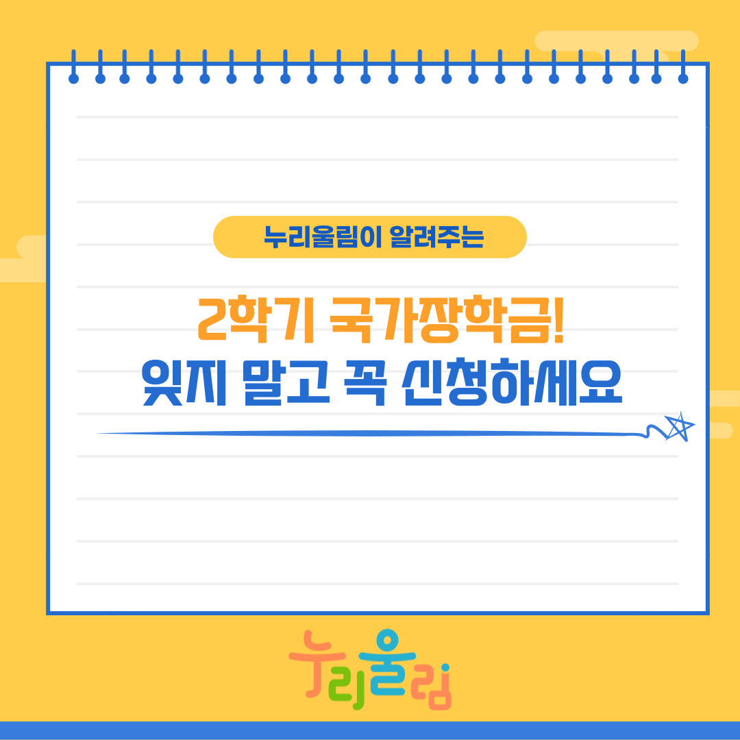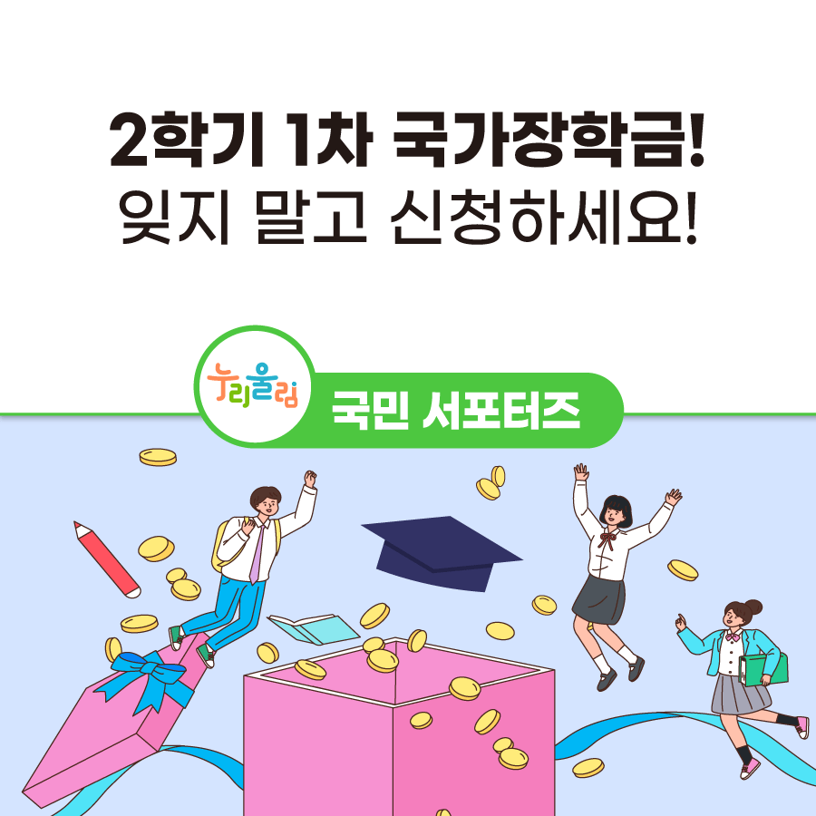 누리울림과 함께 2학기 1차 국가장학금 신청에 대해 알아보았는데요. 대학생과 예비 대학생 여러분, 신청 꼭 잊지 마시고, 앞으로 더욱 풍성해질 국가장학금과 교육정책도 많은 관심 부탁드립니다.
