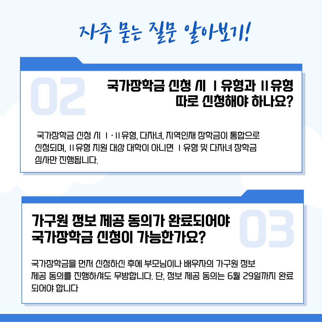 국가장학금을 신청하다 보면 헷갈리고 궁금한 점이 많은데요. 그중 자주 묻는 질문에 대한 답변을 가져왔습니다.