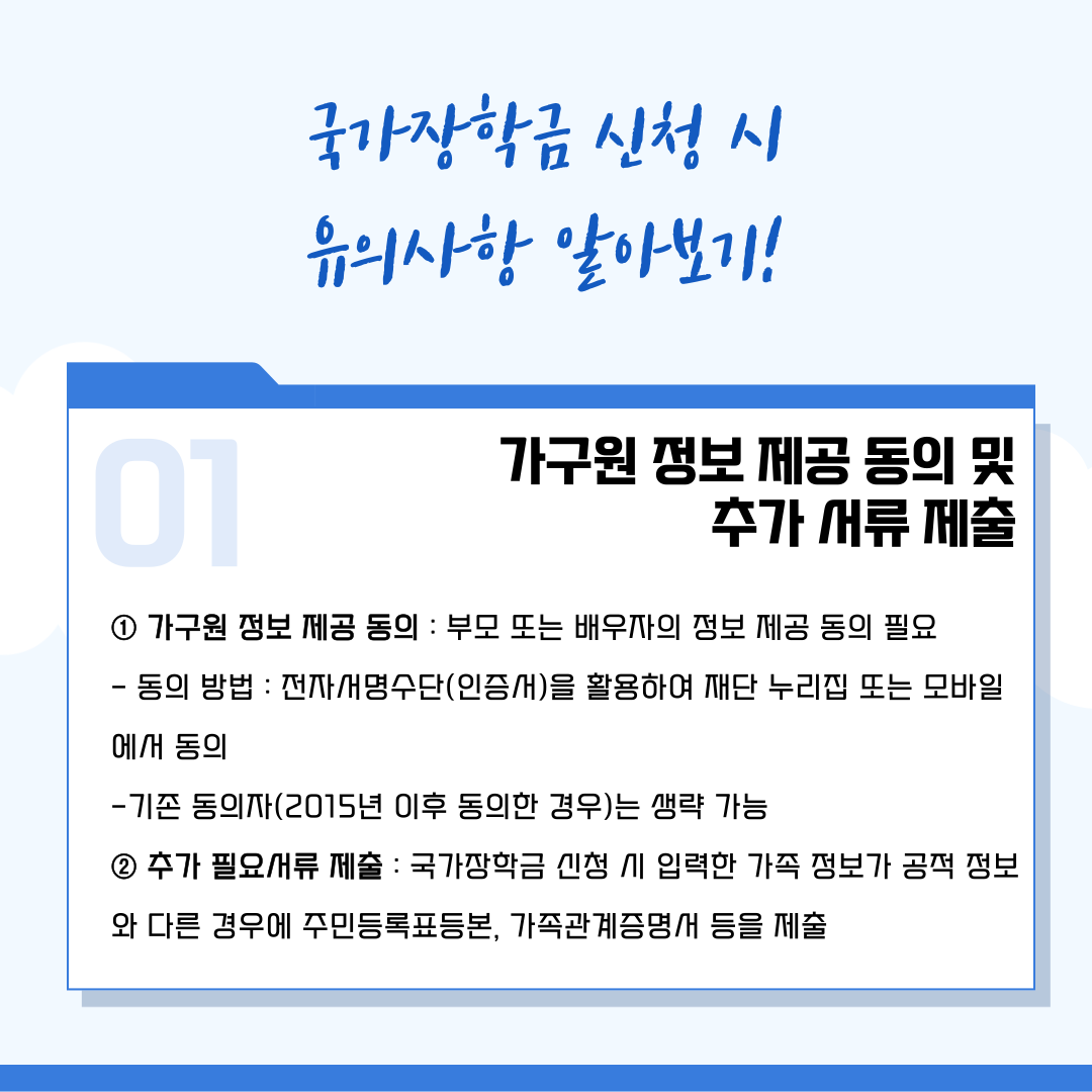 그럼, 국가장학금 신청 시 유의해야 하는 사항들을 알려드리겠습니다. 첫 번째는 가구원 정보 제공 동의입니다. 부모 또는 배우자의 정보 제공 동의가 필요하고, 전자서명 수단을 활용하여 한국장학재단 누리집 또는 모바일 앱에서 진행하시면 됩니다. 두 번째는 국가장학금 신청 시 입력한 가족 정보가 공적 정보와 다른 경우에 주민등록등본, 가족관계증명서 등을 제출해야 합니다.