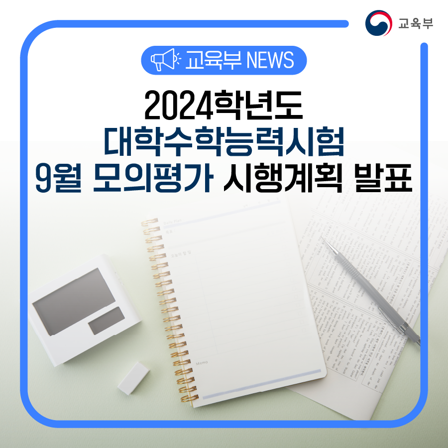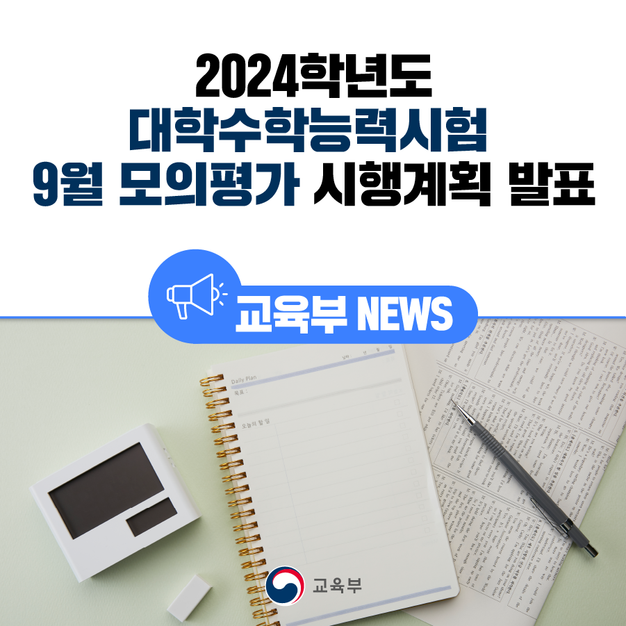 한국교육과정평가원(원장 이규민)은 2023.9.6.(수)에 실시되는 2024학년도 대학수학능력시험 9월 모의평가 시행계획을 2023.6.19.(월)에 다음과 같이 발표하였다.