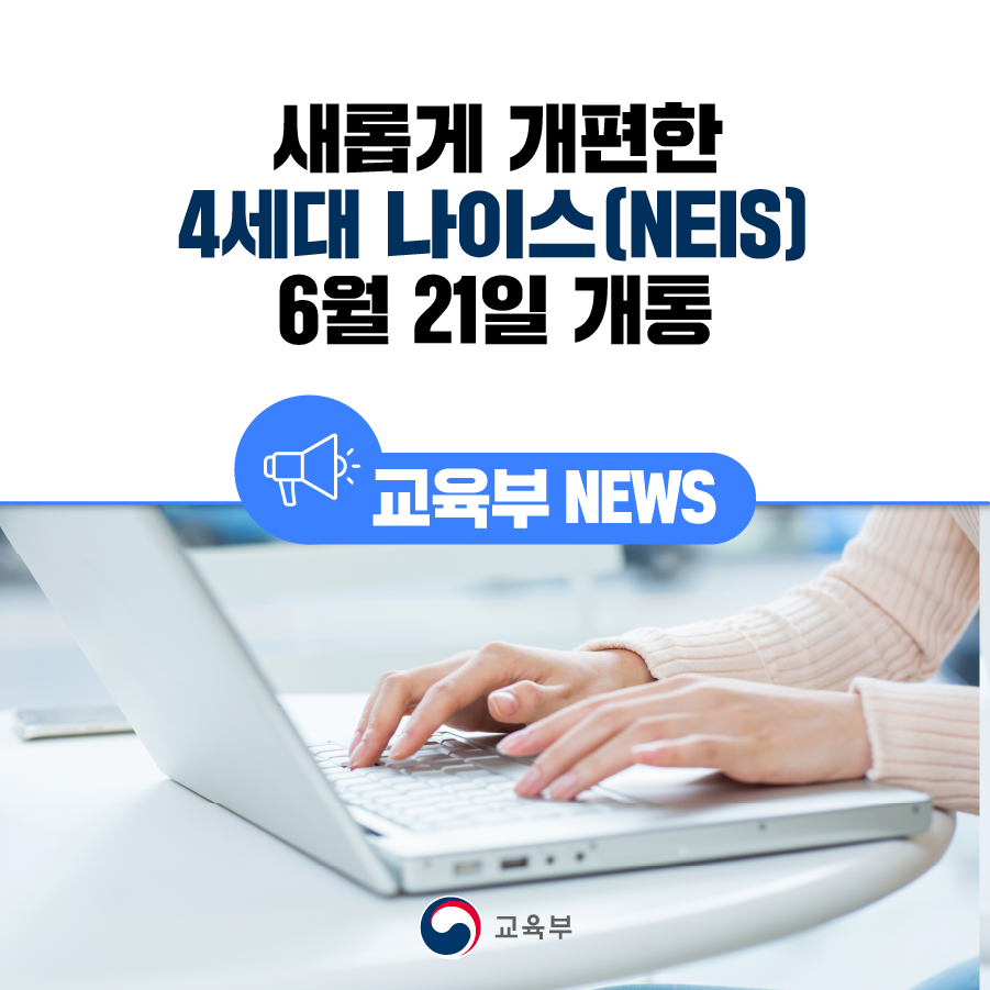 교육부(부총리 겸 교육부장관 이주호)와 한국교육학술정보원(원장 서유미)은 “4세대 나이스(NEIS)”의 구축을 완료하고, 6월 21일(수)부터 17개 시도교육청 및 초·중·고 12,000여 개교에 서비스를 시작한다.