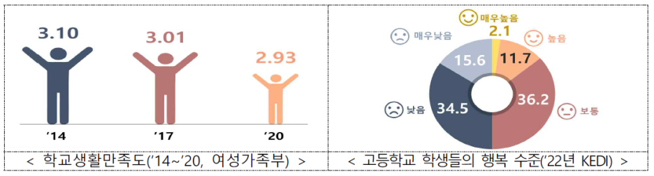 또한, 학생들의 학교생활 만족도 역시 하락하였으며, 학생들의 행복 수준 역시 낮아지고 있다.
