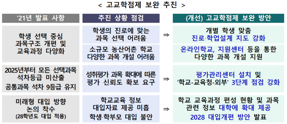 고교학점제를 2025년부터 전면 실시하되, 그동안 학교 현장에서 지속적으로 제기되어 왔던 문제점들을 보완하여 추진한다.