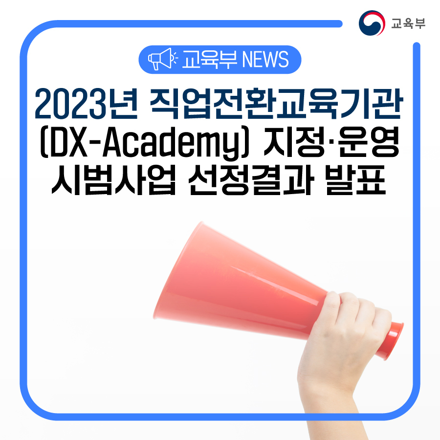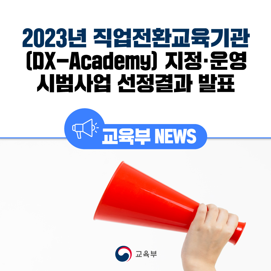 교육부(부총리 겸 교육부 장관 이주호)와 한국연구재단(이사장 이광복)은 6월 27일(화), 2023년 직업전환교육기관(DX*-Academy) 지정·운영 시범사업 선정결과를 발표한다.