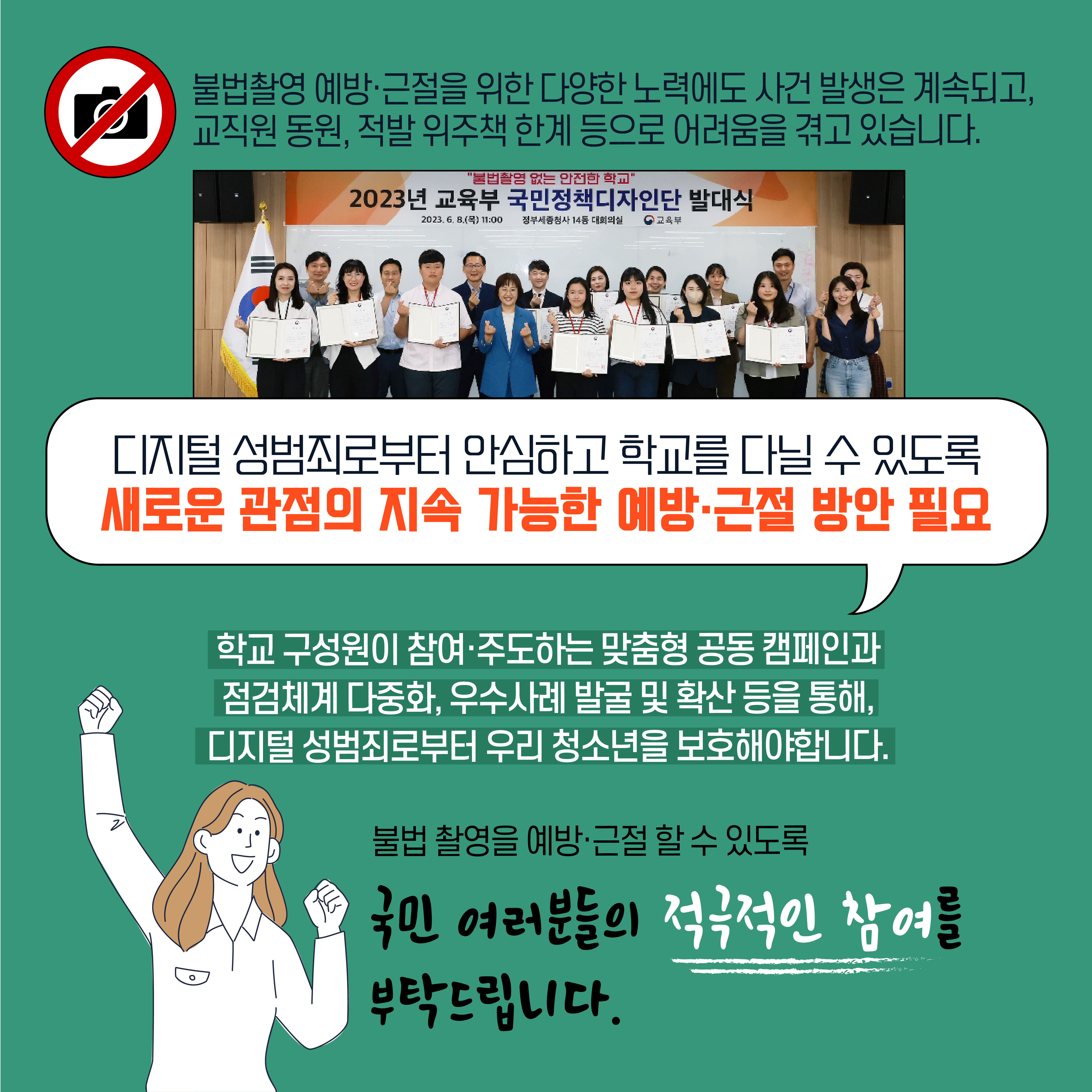 학교 구성원이 참여·주도하는 맞춤형 공동 캠페인과 점검체계 다중화, 우수사례 발굴 및 확산 등을 통해, 디지털 성범죄로부터 우리 청소년을 보호해야 합니다.