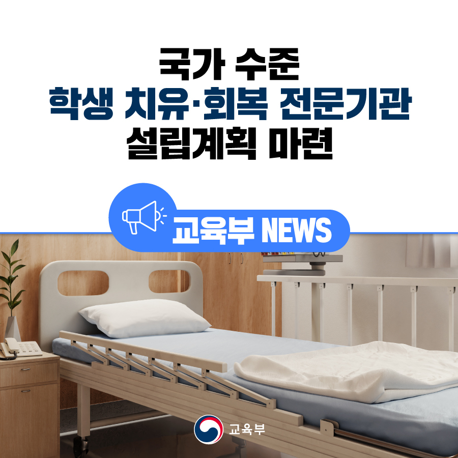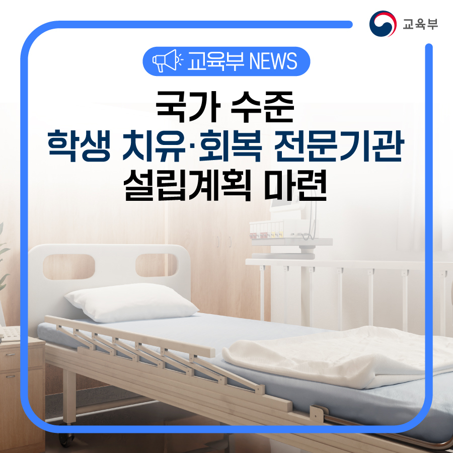 교육부(부총리 겸 교육부장관 이주호)는 6월 30일(금), 학교폭력 및 사회·정서 문제 등 치유가 필요한 학생들을 전문적으로 지원하고, 학생 치유·회복 관련 전문 연구 및 교육 기능을 수행하는 ‘국가 수준 학생 치유·회복 전문기관’ 설립계획을 마련한다.