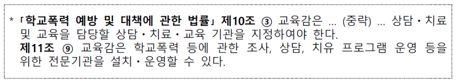 현행 「학교폭력예방법」*은 학생 치유·회복 지원기관을 지정하거나 설치·운영할 수 있는 권한을 시도교육감에게 부여하고 있다. 이에 근거하여 현재 17개 시도교육감은 303개(2023.2월 기준)의 학교폭력 피해학생을 위한 치유·회복 지원기관을 지정 또는 설치·운영하고 있다. 그러나 시도교육감이 지정한 지원기관의 역량을 체계적으로 지원하고, 국가 수준에서 학교폭력 및 사회·정서 문제 등에 전문적으로 대응하는 체계는 부족한 상황이다.