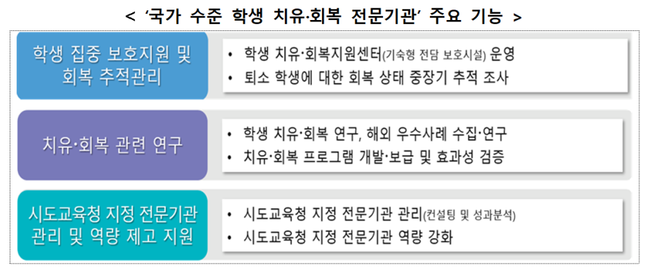 - 국가 수준 치유·회복 전문기관을 통해 체계적인 학생 치유·회복 지원