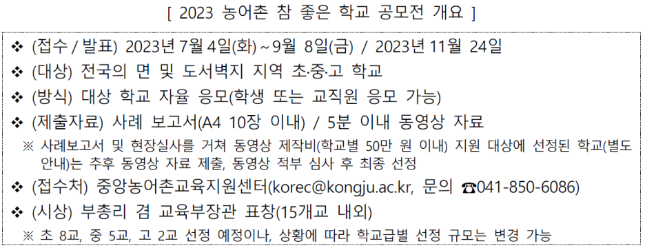 - 2023년 농어촌 참 좋은 학교 공모전 개최(7.4.~9.8.)