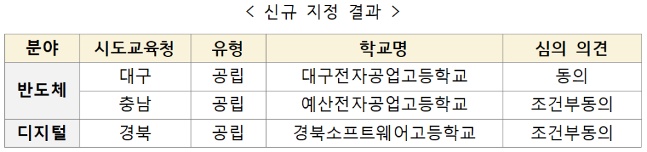 이번 신규 지정을 위해 학계 및 교육·산업 현장 전문가로 구성된 지정위원회에서 신청 학교들을 대상으로 서면·현장 평가를 실시하였고, 교육부는 지정위원회 심의 의견에 따라 지정 동의 1개교, 조건부 동의 2개교 등 총 3개교를 신규 지정 학교로 확정하였다. 조건부 동의 2개교는 8월 18일(수)까지 조건 이행 여부에 대한 확인을 거쳐 9~10월경 최종 지정할 예정이다.