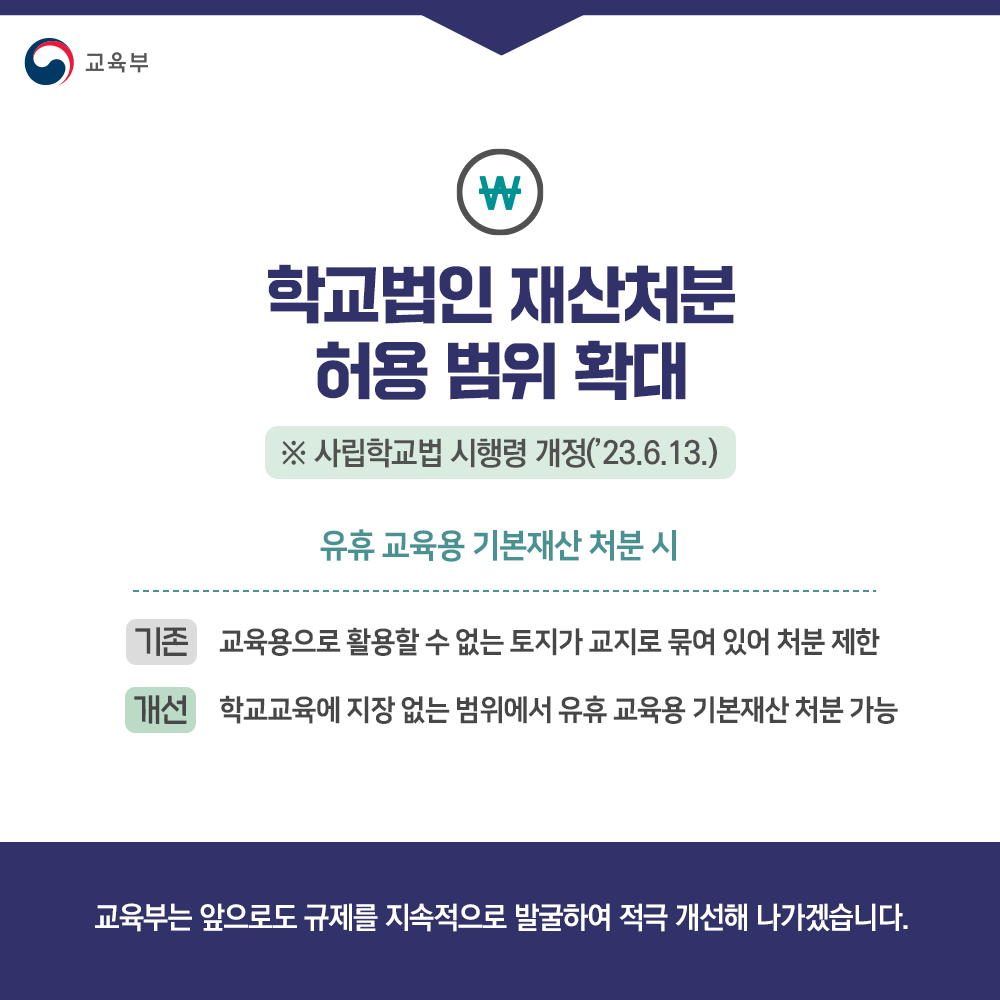 - 개선 : 학교교육에 지장 없는 범위에서 유휴 교육용 기본재산 처분 가능