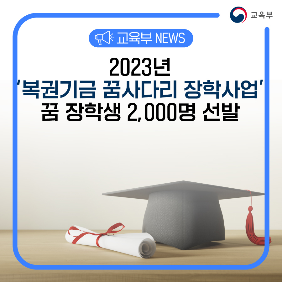 교육부(부총리 겸 교육부장관 이주호)와 한국장학재단(이사장 배병일)은 7월 6일(목) ‘2023년 복권기금 꿈사다리 장학사업’ 꿈 장학생 2,000명을 선발하였다.