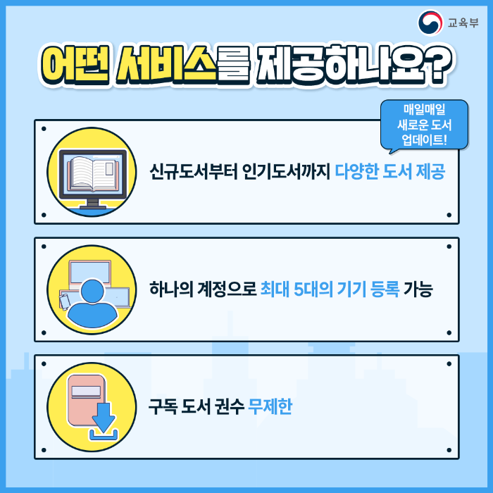 학생의 독서활동, 교원의 교과연계 독서수업을 지원하기 위해 약정기간 동안 전자책을 무료로, 무제한 구독할 수 있는 서비스
