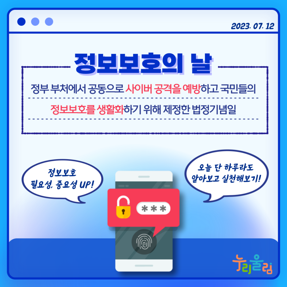 오늘은 정보보호의 날을 맞아 모두가 알고 지켜야 할 정보보호에 대해 알아보고 관련 교육, 정보 등을 함께 소개하겠습니다.