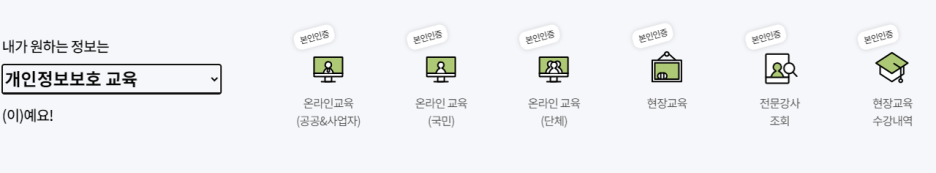 두 번째로 개인정보포털의 정보보호 교육입니다. 미취학 아동부터 초중고 학생 대상으로 수준별 온라인 교육이 있으며 단체교육, 공공 및 사업자 교육, 현장교육 등을 신청할 수 있습니다.