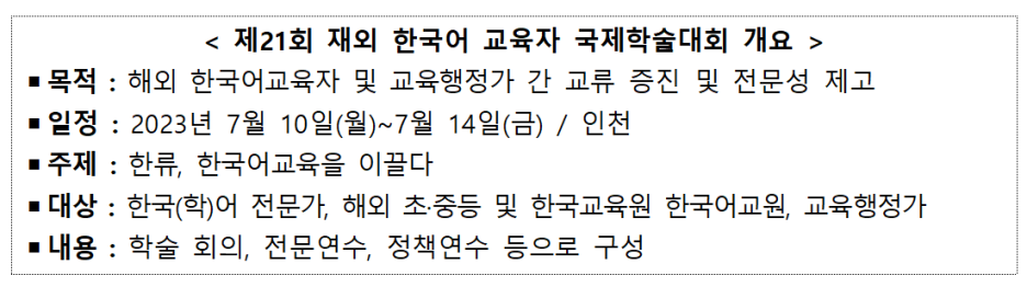 - 표창 수여식과 함께 47개국, 500여 명의 해외 한국어교육자가 참석하는 국제학술대회 개최, 한국어가 세계적 언어로 도약하기 위한 발전 방안 모색