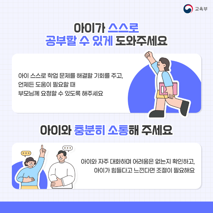 아이 스스로 학업 문제를 해결할 기회를 주고, 언제든 도움이 필요할 때 부모님께 요청할 수 있도록 해주세요.