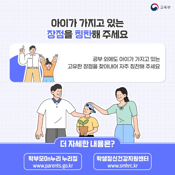 공부 외에도 아이가 가지고 있는 고유한 장점을 찾아내어 자주 칭찬해 주세요.