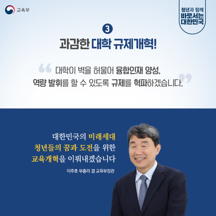대학이 벽을 허물어 융합인재 양성, 역량 발휘를 할 수 있도록 규제를 혁파하겠습니다.