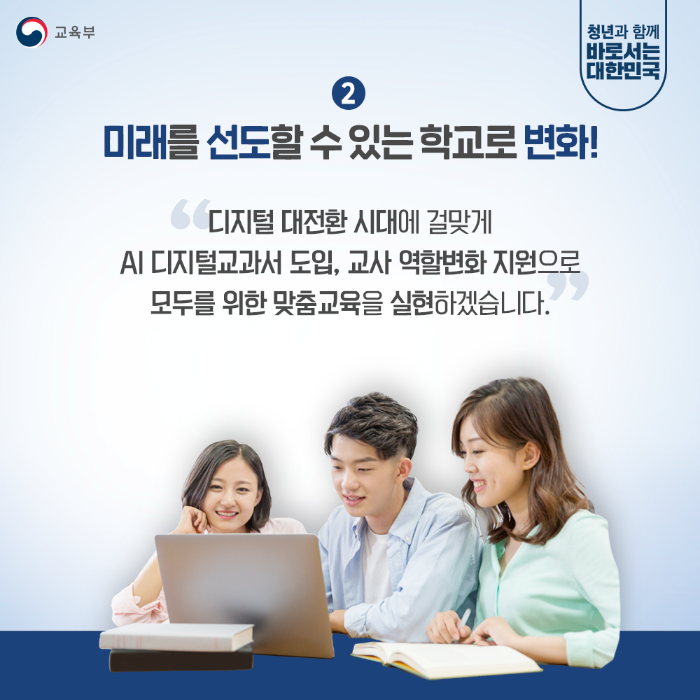 디지털 대전환 시대에 걸맞게 AI 디지털교과서 도입, 교사 역할변화 지원으로 모두를 위한 맞춤교육을 실현하겠습니다.