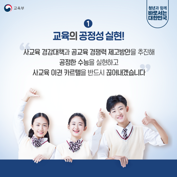 사교육 경감대책과 공교육 경쟁력 제고방안을 추진해 공정한 수능을 실현하고 사교육 이권 카르텔을 반드시 끊어내겠습니다.