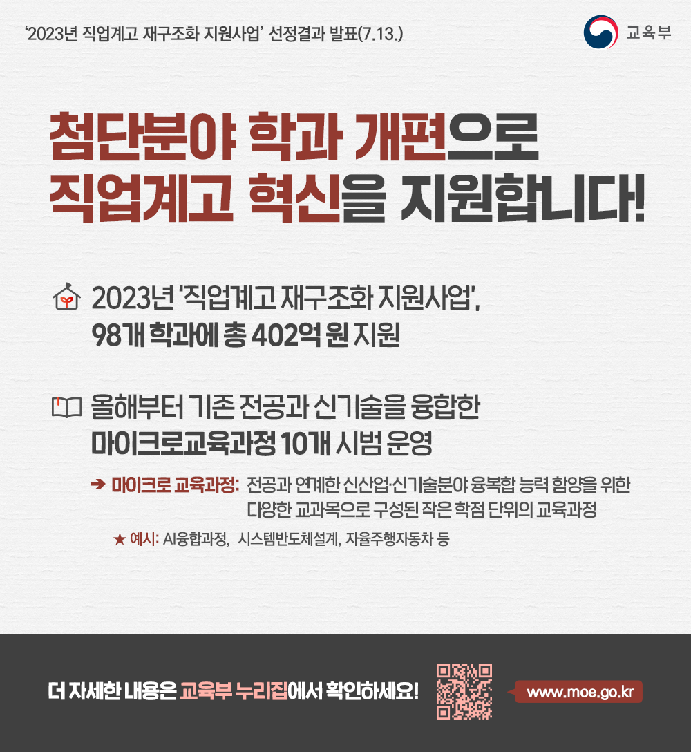 - 2023년 '직업계고 재구조화 지원사업', 98개 학과에 총 402억 원 지원