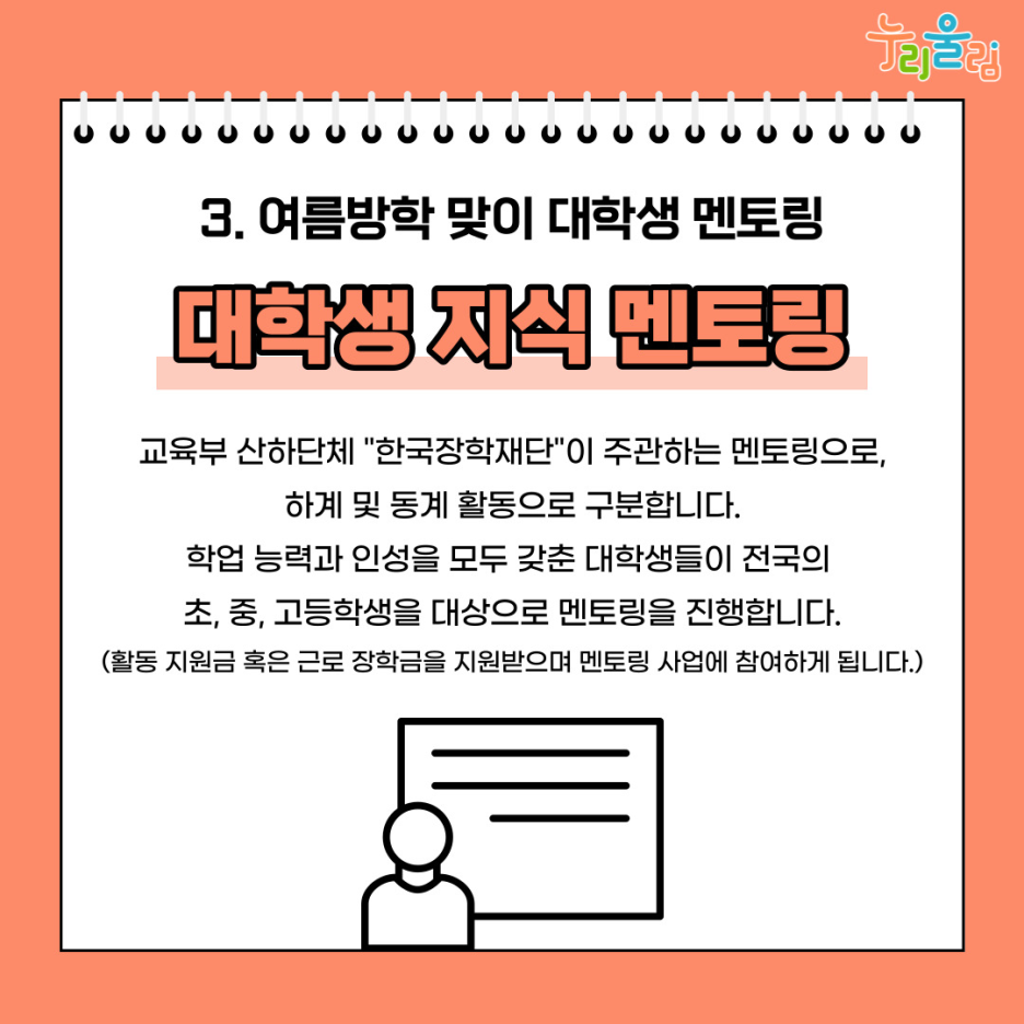 대학생 재능봉사 캠프, 다문화/탈북학생 멘토링, 대학생 청소년교육지원장학금으로 구성되어 있고 각 활동에 따라 활동 지원금이나 근로 장학금을 받으며 멘토링 사업에 참여할 수 있습니다. 학습 및 진로지도와 고민 상담, 예체능 분야의 창의 활동과 같은 주제에 관심이 많고 리더십을 기르고 싶은 모든 대학생에게 추천합니다.
