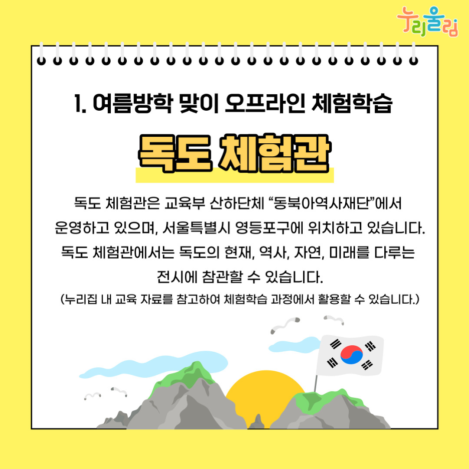 그리고 7월 24일부터 독도체험관에서 여름방학 프로그램을 진행하는데요. 독도 배지 만들기, 내가 만드는 독도, 나는야 독도 탐험가 등 다양한 교육 프로그램이 진행하니 참여해 보시면 좋을 것 같습니다.