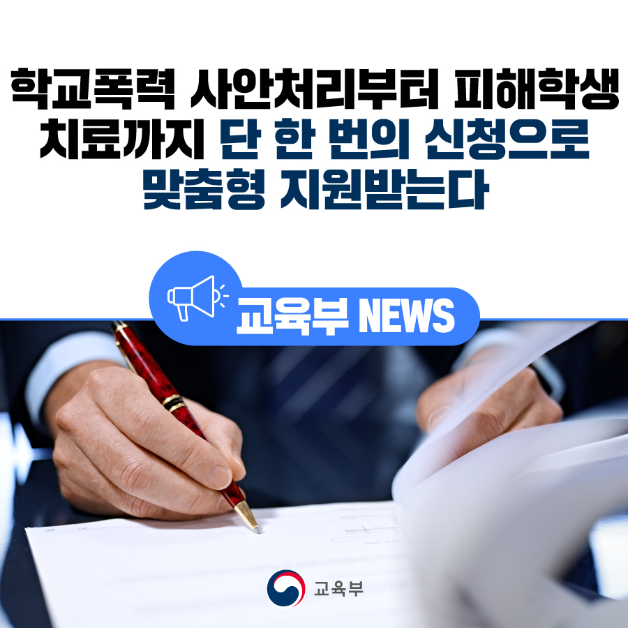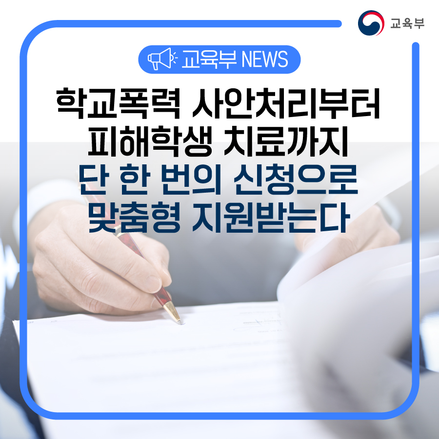 학교폭력 사안처리부터 피해학생 치료까지 단 한 번의 신청으로 맞춤형 지원받는다. 본문