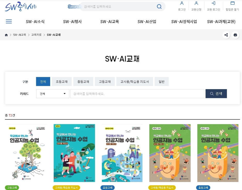 마지막으로 SW·AI 교육에 관심이 있다면 SW중심사회 누리집을 활용해 보세요! SW중심사회 누리집에서 SW·AI교육>교육자료>SW·AI교재 카테고리를 누르면 참고할 수 있는 교육자료를 제공하고 있습니다.