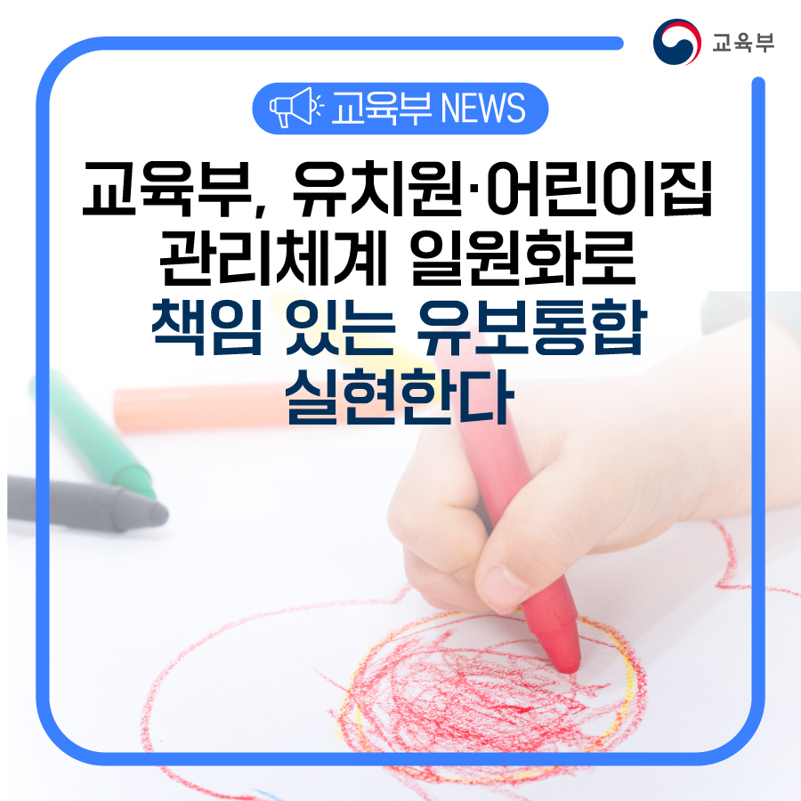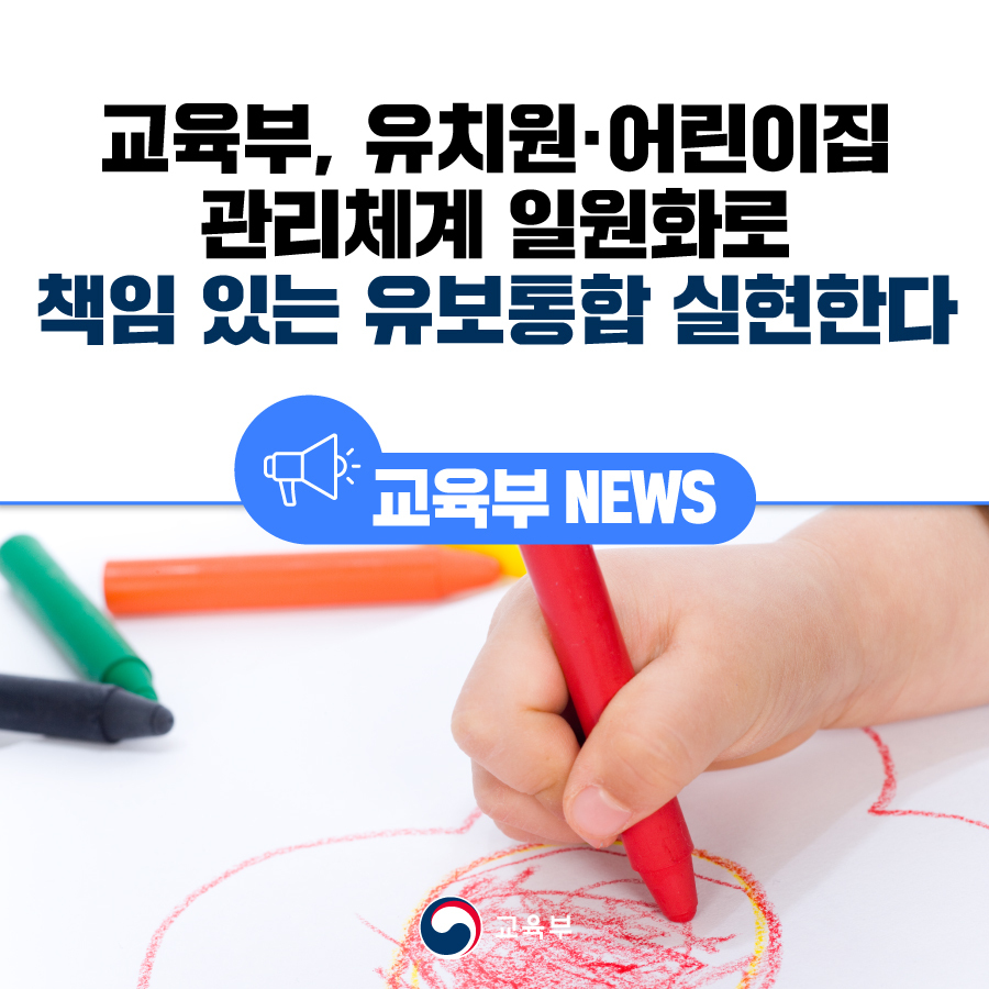 교육부, 유치원·어린이집 관리체계 일원화로 책임 있는 유보통합 실현한다. 본문