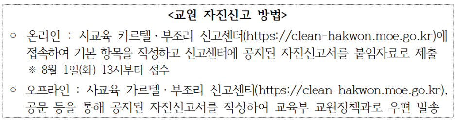 - 사교육업체와 연계된 교원의 영리 행위에 대한 자진신고 기간 운영(8.1.~8.14.)