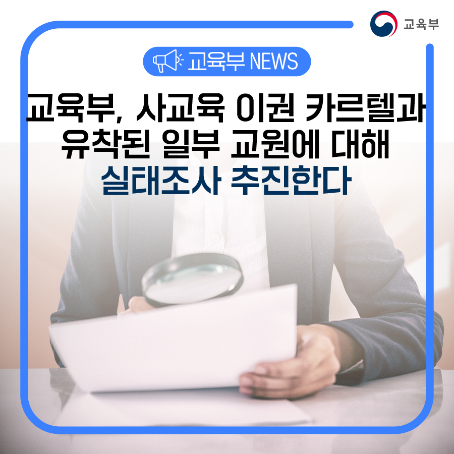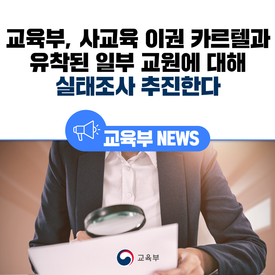 이번 실태조사는 지난 7월 22일(토) 열린 제3차 사교육 카르텔・부조리 범정부 대응협의회 논의 결과에 따라, 일부 교원과 사교육업체 사이에 형성된 이권 카르텔을 끊어내기 위한 후속 조치로 추진된다.