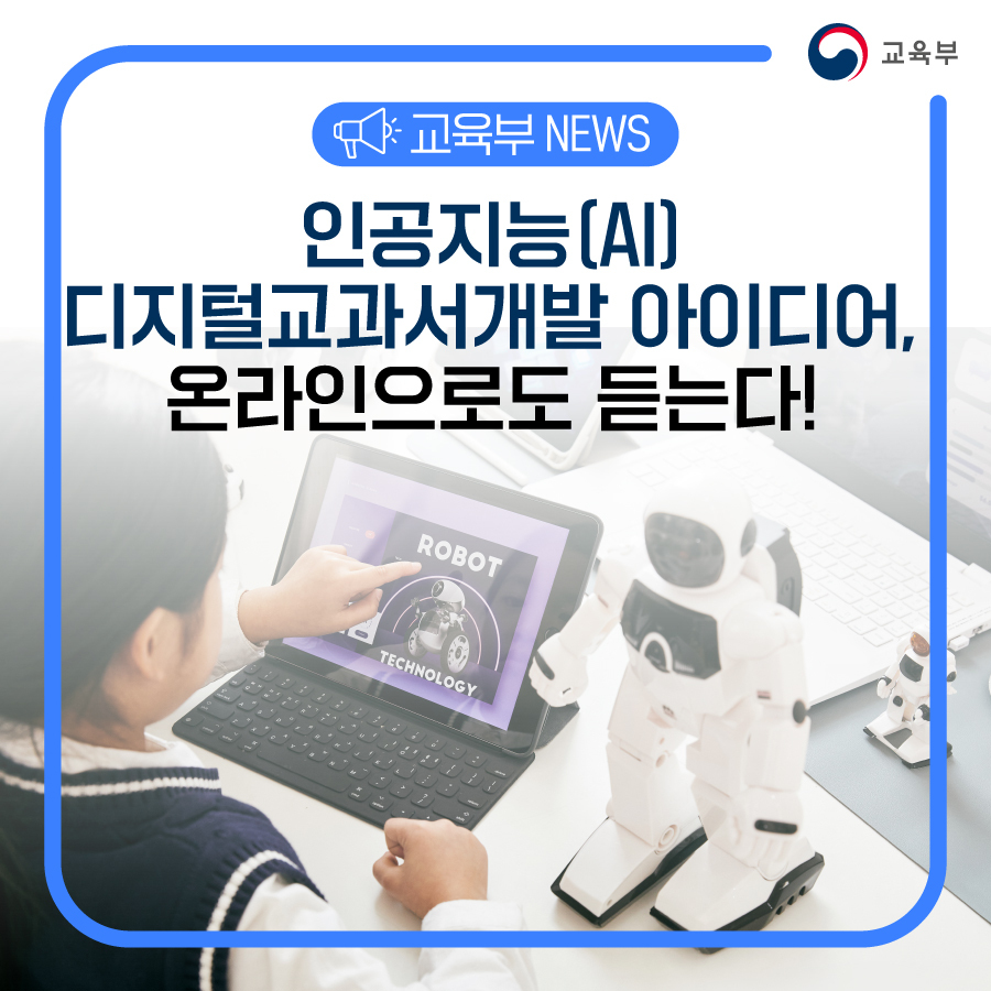교육부(부총리 겸 교육부장관 이주호)는 8월 4일(금)부터 8월 13일(일)까지 10일간 온라인을 통해 2025년 도입 예정인 수학, 영어, 정보 및 국어(특수교육) 교과 교사를 대상*으로 인공지능(AI) 디지털교과서 개발을 위한 아이디어를 듣는다.