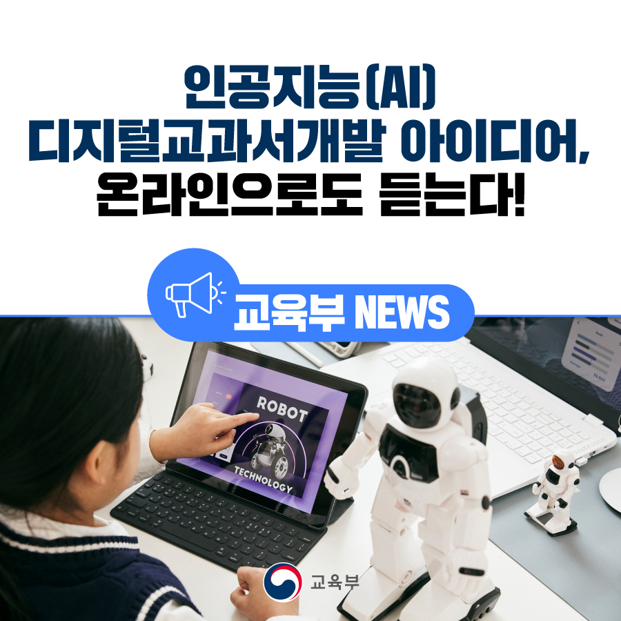 교육부(부총리 겸 교육부장관 이주호)는 8월 4일(금)부터 8월 13일(일)까지 10일간 온라인을 통해 2025년 도입 예정인 수학, 영어, 정보 및 국어(특수교육) 교과 교사를 대상*으로 인공지능(AI) 디지털교과서 개발을 위한 아이디어를 듣는다.