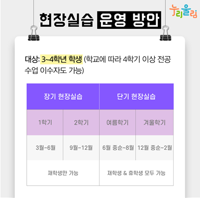 현장실습은 장기·단기 현장실습, 본학기 및 계절학기를 연계한 현장실습 등이 있는데요. 장기 현장실습은 학기 과정으로 3월~ 6월에 진행되는 1학기 장기 현장실습, 9월~12월에 진행되는 2학기 장기 현장실습이 있습니다. 장기 현장실습은 학기 과정이므로 등록금 납부 및 수강신청을 완료한 재학생만 가능하며 학점인정 기준은 학교별로 상이합니다.