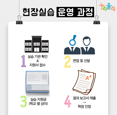 현장실습은 각 학교 현장실습 홈페이지에서 실습 기관을 확인하고 학생 본인이 직접 지원서를 접수한 뒤 실습 기관에서 면접 및 선발을 진행합니다. 현장실습이 끝나고 학생이 결과 보고서를 제출하면 학점을 인정받을 수 있습니다. 또한, 참여기업으로부터 실습 지원비가 지원되는데요. 자세한 사항은 각 학교의 현장실습지원센터에 문의하면 좋을 것 같습니다.