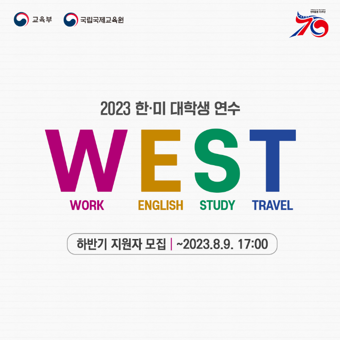 대한민국 교육부 2023. 8. 4. 10:422023 한·미 대학생 연수 WEST의 하반기 지원자를 모집합니다!