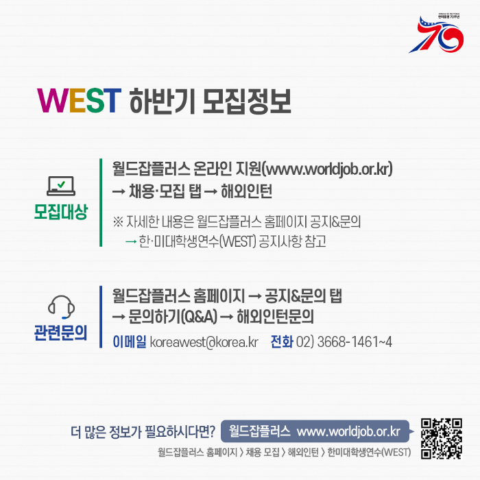 월드잡플러스 : www.worldjob.or.kr월드잡플러스 홈페이지 > 채용 모집 > 해외인턴 > 한미대학생연수(WEST)
