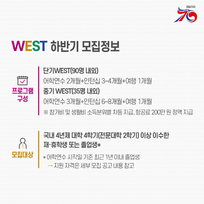 - 단기WEST(90명 내외) : 어학연수 2개월 + 인턴십 3~4개월 + 여행 1개월