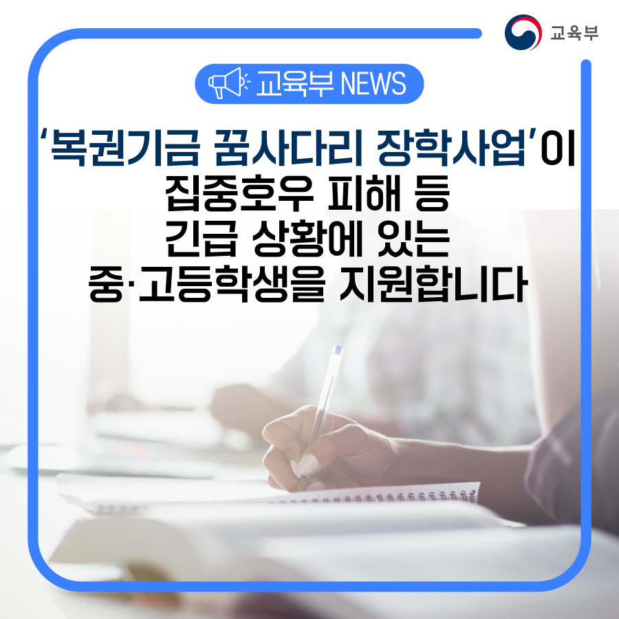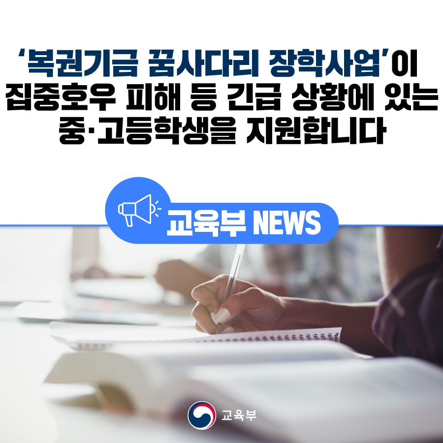 ‘복권기금 꿈사다리 장학사업’이 집중호우 피해 등 긴급 상황에 있는 중·고등학생을 지원합니다. 본문