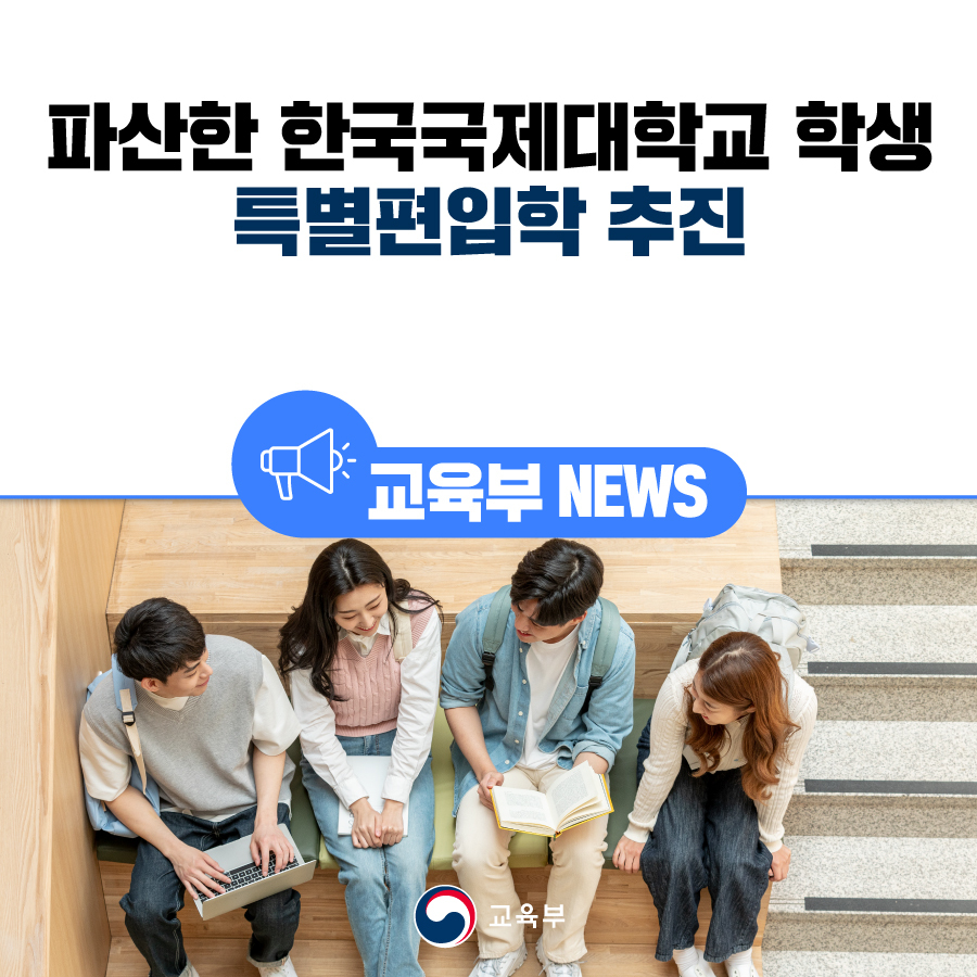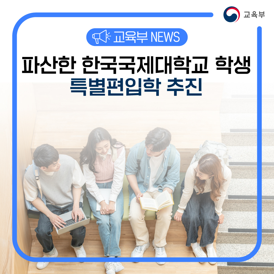 교육부(부총리 겸 교육부장관 이주호)는 학교법인 일선학원의 파산선고(2023.7.12.)로 인해 8월 31일(목) 자로 폐교가 확정된 한국국제대(경남 진주시 소재) 재적생에 대한 특별편입학을 추진한다.